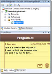 "StickyNotes is a Visual Studio package that provides sticky notes capabilities to project and project items inside Visual Studio 2008.