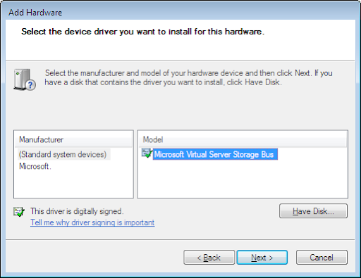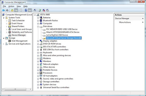 You should get an error or it just won't work... The next step is to update the "Microsoft Virtual Server Storage Device" Driver.