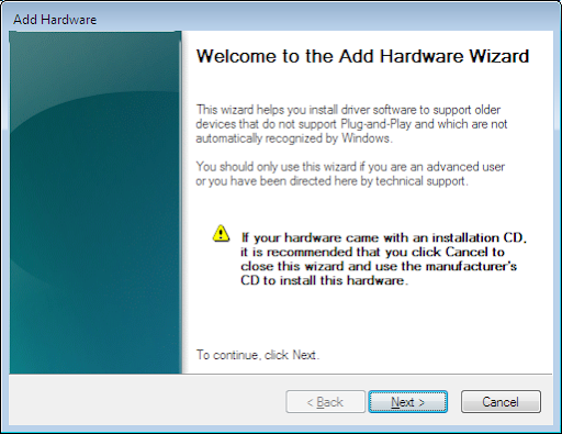 Go to the Control Panel, switch to Classic View and then click on Add Hardware.