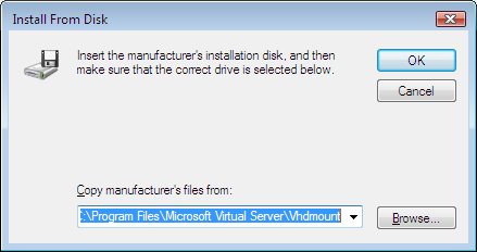 I felt installing Virtual PC 2007 to do this was overkill. Again all I wanted to do was mount the VHD as a drive letter and quickly browse it... VHDMount from Virtual Server 2005 R2 SP1 sounded like just the thing. Should be quick and easy, right?