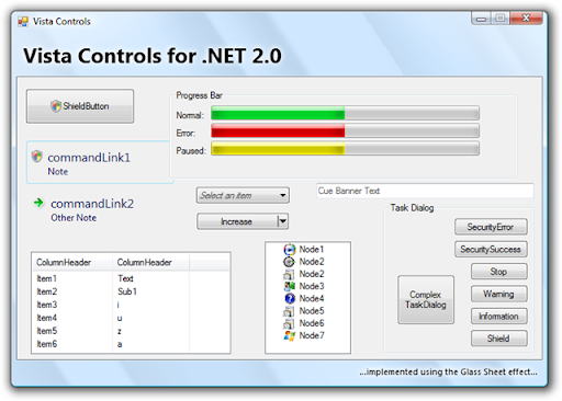 "This project aims to create a Windows Control Library that provides controls reproducing the appearance of Windows Vista objects, like buttons and links with shield icon, textboxes with cue banner, etc.